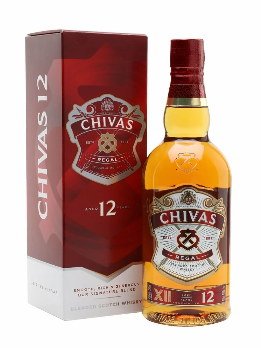 A classic 12-year-old blended whisky from Chivas Regal, made up of a blend of malt and grain whiskies, including Strathisla single malt, Strathclyde grain whisky and more. Aromas of wild herbs, honey, heather and orchard fruits fill the nose, complemented by notes of vanilla, pears, hazelnuts, butterscotch and honey throughout the palate.