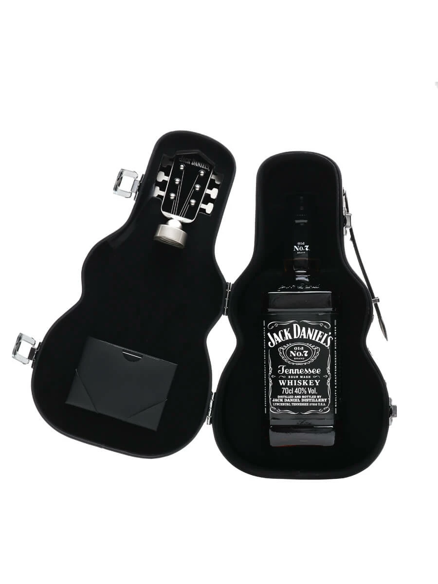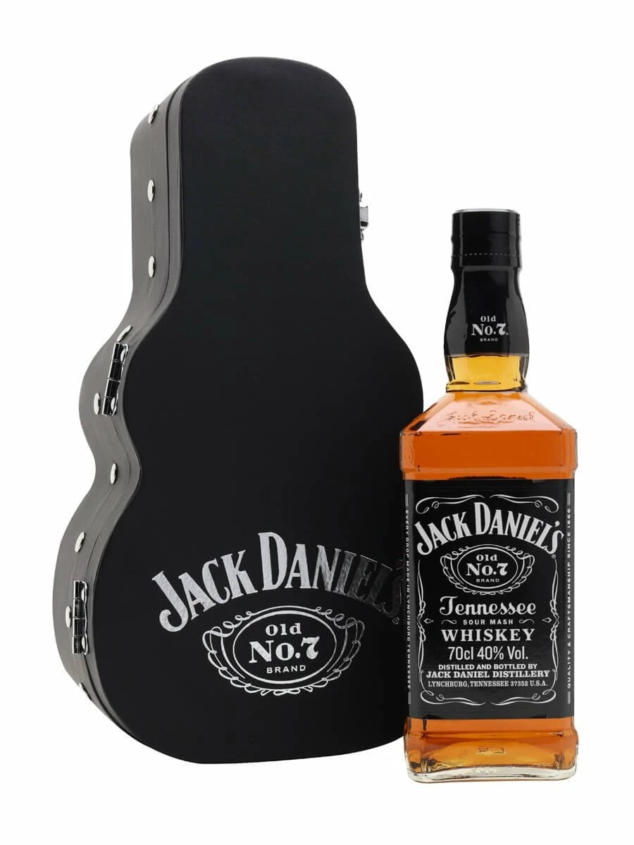 A bottle of Jack Daniel’s Old No. 7, presented in a whimsical guitar case. The original all-conquering cola-friendly colossus, Jack Daniel’s No. 7 commands a legion of fans worldwide, thanks to the sweet smoothness imparted by the Lincoln County Process of charcoal-mellowing the spirit before maturation.