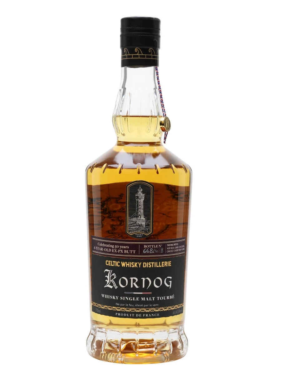 A 2016 Kornog Peated French single malt from Celtic Whisky Distillerie that was specially selected by The Whisky Exchange and bottled after six years in a single Pedro Ximenez sherry butt. The result is a whisky that is full of sweet smoke, ripe cherries, chocolate, apple crumble, stewed fruit and a delicate sherry influence.